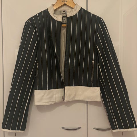 Madridista design-puodista ostettu tyylikäs Italiassa valmistettu valkoinen nahkatakki / pleiseri, aitoa nahkaa. Merkki on IESSE. Ohut kangasvuoro sisäpuolella, lämpimille ilmoille. Pari kertaa käytetty, kuin uusi.
