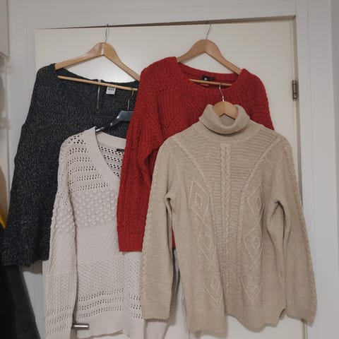Myydään kuvan 6 paitaa ja yksi neuletakki. Ehjiä. Koot L-XL. Zizzi, Lindex, Vila, Kappahl.