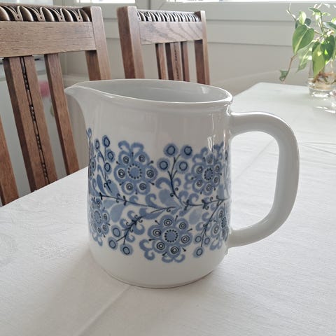Raija Uosikkinen (koriste) ja Kaj Frank suunnitteli Arabialle kauniin sinisellä koristeella kannun jonka korkeus 15,5 cm, suuaukon halkaisija n 10.5.cm Kaadinta valmistettu vuosina 1963-1969