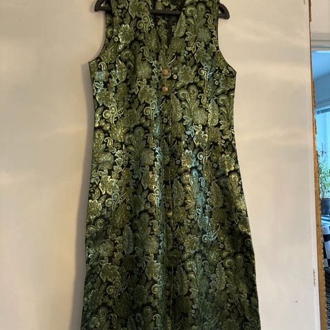 Itsetehty retro liivimekko, käyttämätön. Jouluessu. Vyötärön ympärys 80cm ja hameosan pituus 91cm. En käytä toridiiliä, mutta postitus onnistuu.