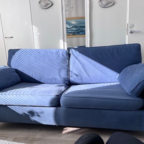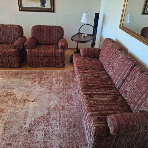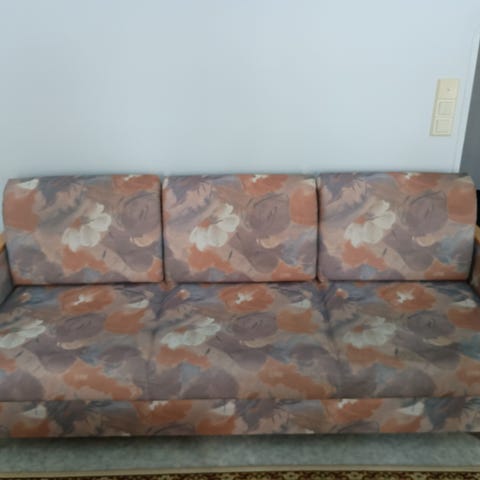 Sohvaryhmä on ehyt,normi kulumaa käsinojissa. Rullat takajalkojen alla,helpottaa liikuttelua. Sohvan koko leveys 212cm ja koko syvyys 90cm. Tuolin koko leveys 88cm ja koko syvyys 90cm. Näihin on helppo löytää uudet pehmusteet. Mutta jos haluaa ompeluttaa uudet niin tuoleihin on pehmusteet joista saa mallin. Patjoista kuva ja sohvassa on ollut 3 samanlaista istuin pehmuketta mutta niitä ei ole enää. Satulanauhat ovat ehyet. Pikku hionta ja vaikka puuvaha niin saat upean ryhmän. Saa vuodesohvaksi ja tuolitkin mukavaan lepo asentoon