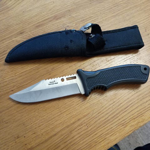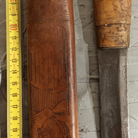 J. Marttiinin valmistama retkeilypuukko nahkaisella kotelolla.