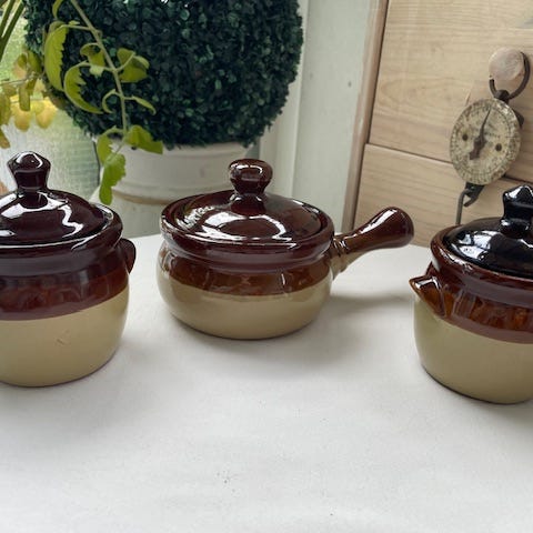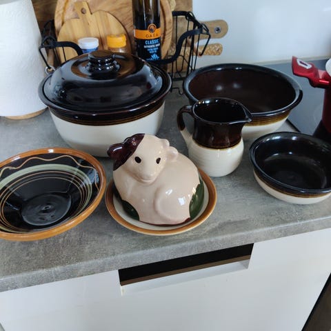Keramiikka setti: vuoka, kippo, kulho, 2 kpl. (tilavuus 0.6 l), pata (tilavuus 1,2 l). Kaikki on hyväkuntoinen ja ehjä.