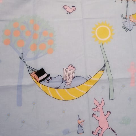 Itse ommellut Muumi-verhot lastenhuoneeseen. Tankokujalla. Pinkki- punasävyinen kork.n. 152 - Leveys 142cm