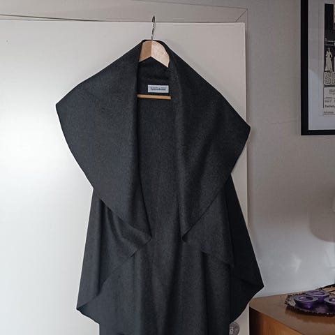 Laskeutuu kauniisti, ja lienee sopivin kokoa M/L käyttävälle. Pituus takana niska-helma noin 73 cm ja kuva 2. kaltaisesti etuliepeiden mennessä päällekkäin, kainalosta kainaloon mitta vajaa 60 cm. Ei tietoa hankintapaikasta, sain tämä lahjaksi, eikä ole ikinä tullut käytettyä. Materiaali lienee polyesteri, ei rypisty ja kuosikin antaa sen anteeksi, jos niin käy.