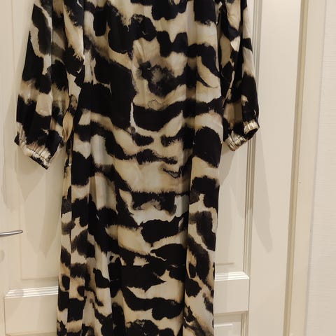 Itsetehty uniikki mekko . Päällys läpinäkyvää kangasta vuori joustava. Helma pussimainen. Pituus olka-helma 105 cm, kai- kai 57 cm.