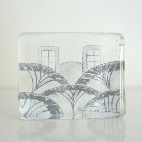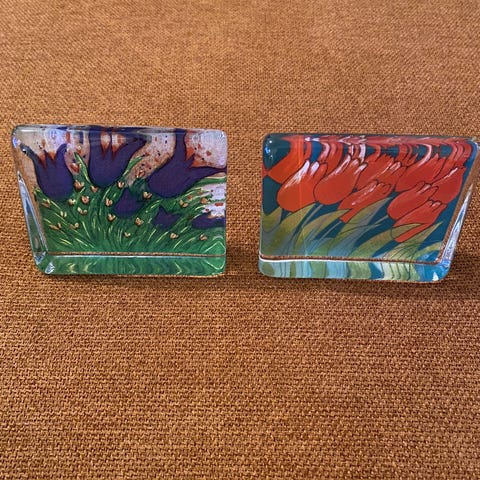 Arabia Lasikortti, Tulppaanit, jossa on punaiset tulppaanikuvioinnit ja vihreä tausta. Lasikortti on suorakaiteen muotoinen ja valmistettu lasista. Täysin ehjä ja Kyljessä nimi: Heljä Liukko-Sundström