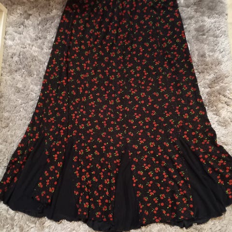 Musta Puolihame, jossa pieniä pallo kuvioita, koriste nauha keskellä, koko XXL, kuminauha vyötärö, materiaali 90%polyesteria, Huom! 10%elastaania, vyötärön mitta 45cm(venutettuna 74cm), pituus edestä 55cm, pituus sivuista 88cm, hyvä kuntoinen.