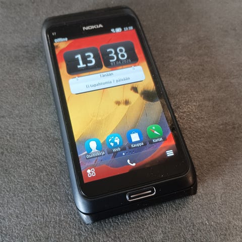 Nokia E65 älypuhelin. Vuodelta 2007. Oli aikanaan suunniteltu yrityskäyttöön. Mukana alkuperäinen laturi ja yli 100 sivuinen ohjekirja.