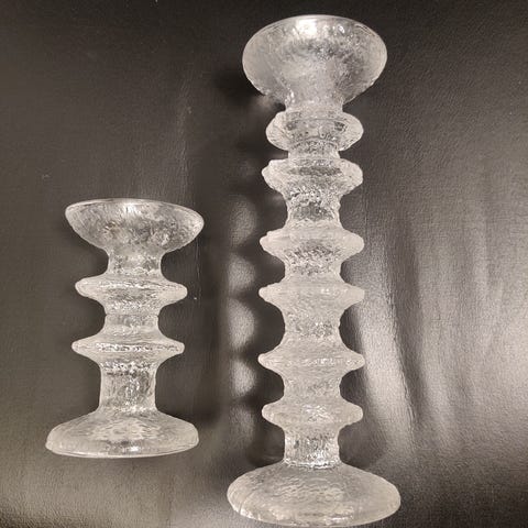 Vanhat, ehjät, hyväkuntoiset ja TS. signeeratut kynttilänjalat, 2kpl. Tarrat kuluneet, muuten ei huomautettavaa.