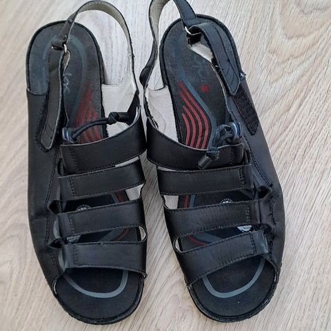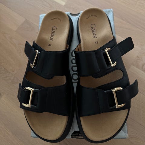 Käyttämättömät mustat Promena sandaalit. Koko 42. Sandaaleissa on nahkaiset siteet ja puiset alustat.