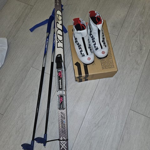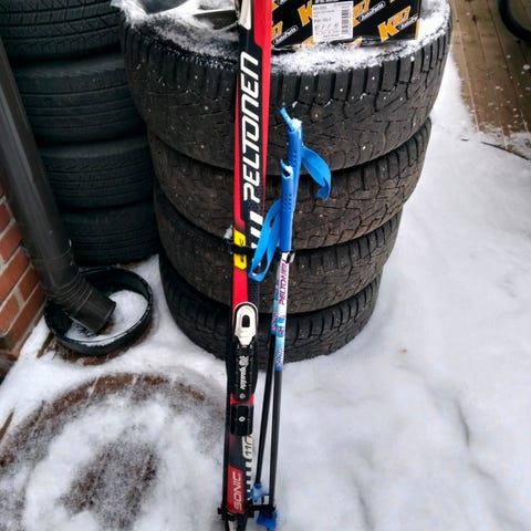 Peltonen, siniset lasten hiihtosukset ja sauvat.