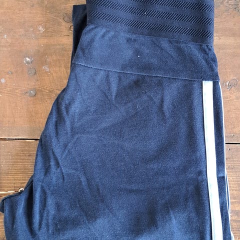 Adidas Aeroready-trikoot, joissa veroketjutasku ylhäällä takana. Vyötäröllä kiristysnauha ja lahkeissa heijastimet. Pientä ompeleen rispautumista yhdessä kohtaa (kuva), muuten hyväkuntoiset.
