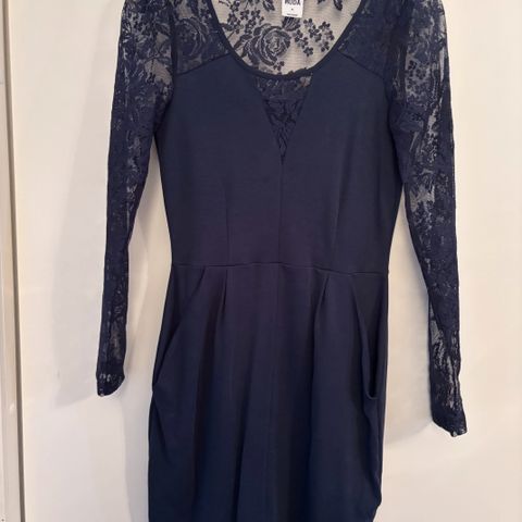 Pari kertaa käytetty lyhyt mekko. Sivulla on vetoketju, pitsiä takana. Mekossa on itsestään ohut alushame. 60% puuvillaa, 35% elastaania, %5 polyesteria. Mieluummin nouto.