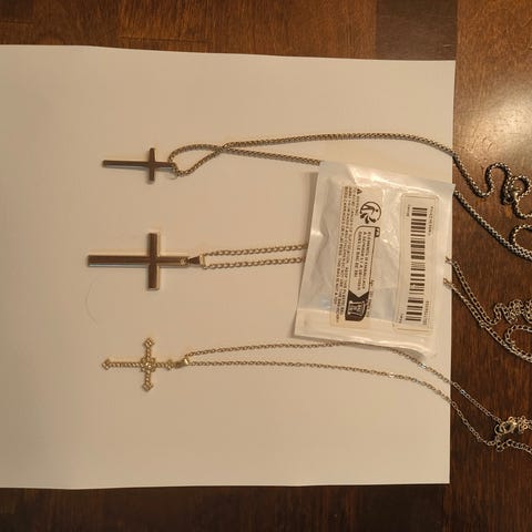 Kullan värinen risti, valmistajaa ei ole tiedossa. Ei ole kultaa eikä hopeaa! Mukana olevassa lapussa maininta Swarovski elements. Ristin korkeus 4cm ja ketjun pituus 46 cm + 6cm säätövaraa. Koru on käyttämätön.