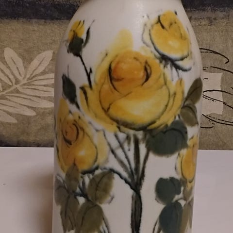 Myydään kuvanmukainen vanha käsinmaalattu Arabia/ARA maljakko. Yleisilme siist, maali paikoin kulunut ruukun alaosasta (kuva). Ruukun sisällä pohjasta lakkaus osittain irronnut.