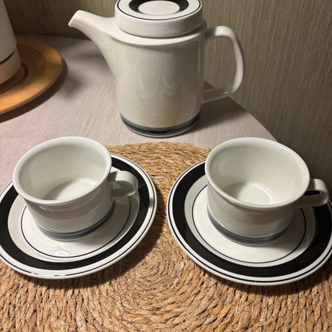 Yksi täydellinen setti + yksi kuppi. En löydä moitittavaa, pienen pieniä käytön jälkiä lautasessa, kupit kuin uudet.