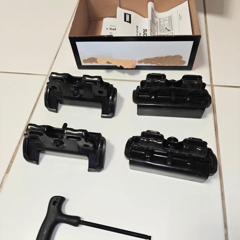 Automallikohtainen asennussarja taakkatelineiden jalkojen kiinnittämiseksi autoon.