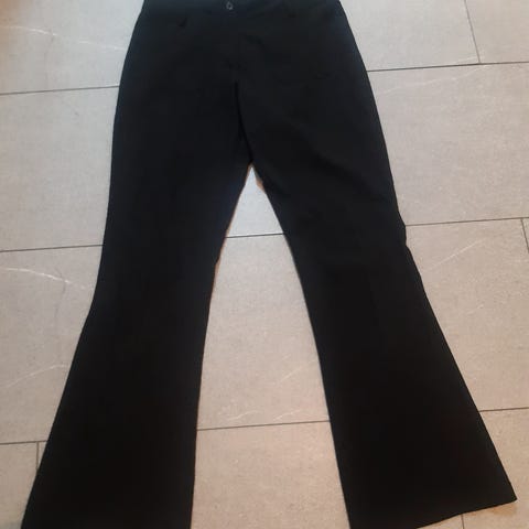 Mustat Housut, koko C36, edessä vetoketju, nappi, taskut, vyön lenkit, punteissa kuminauha lenksut, materiaali 100%polyesteria, vyötärön mitta 35.5 cm edestä mitta, puntin mitta haaroista puntin suuhun 82cm, mitta sivusta vyötäröltä puntin suuhun 104.5cm, hyväkuntoiset.