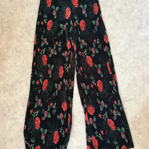 Valkoiset kukkakuvioiset housut. Melko paksua puuvillakangasta. Käyttämättömät. Merkki Freedom.