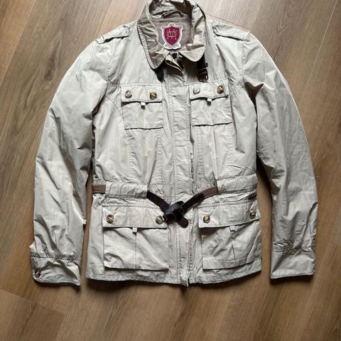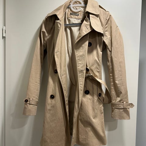 Massimo Dutti tyylikäs, vaalean ruskea tai tumma beige puolipitkä naisten trenssitakki. Kangas liukasta ja vähän kiiltävää. Ohut vaalea tikki - vuorikangas.