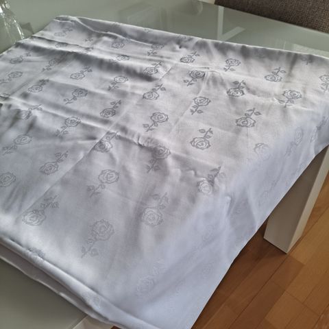98 x 88 cm kokoinen damastiliina. Harmaa/valkoinen.