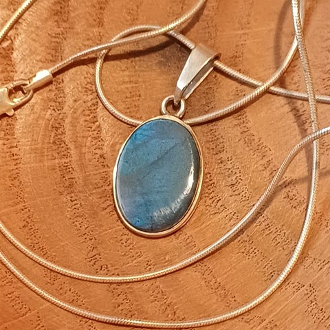Hopeakyyhkyn hopealangasta käsin tehty iso uniikki riipus jossa kaunis labradoriitti-kivi.