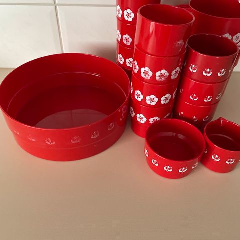 Nämä kaikki punaiset retroastiat pakettihintaan: salaattiottimet, suuri kannellinen tarjoilukulho, lasinaluset 4kpl ja munakupit 4kpl.