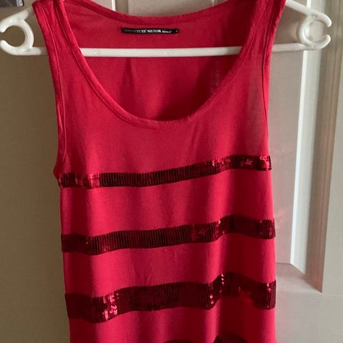 Marks & Spencer-merkkinen hihaton vaaleanpunainen toppi, jossa on edessä paljetti- ja helmikoriste. Kerran käytetty. UK koko 14, joka vastaa n. kokoa L.
