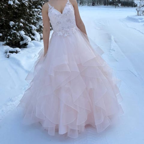 Mekko on ostettu uutena zazabellasta, ja sillä on tanssittu kerran. Mekossa ei ole käytön jälkiä, eli on kuin uuden veroinen. Olen 164cm pitkä ja tanssin tennareilla, mekkoa ei ole lyhennetty. Mekko on kokoa 32, mutta selän nyöritykset antavat säätövaraa. Käytän normaalisti kokoa s.