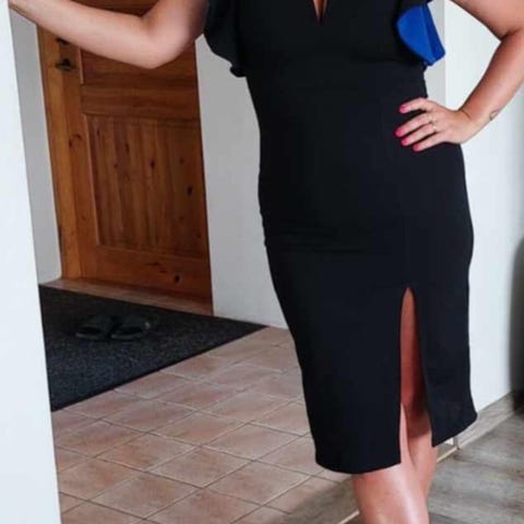 Juhlamekko,musta,tyylikäs,uudenveroinen ,vetoketju ja syvä V-muotoinen aukko takana, koko L,kai-kai 52 cm,pit.92cm,vuorattu.