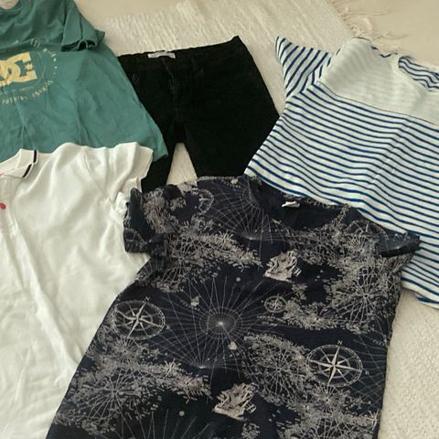Kuvan vaatepaketti, neljä vähänkäytettyä t-paitaa ja shortsit . Kukalliset ovat hieman pienempiä, koko näkyy kuvissa. Nouto, lähetys, taloudessa koira.