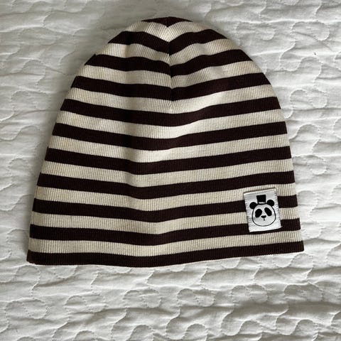 52/54 Mini Rodini musta hattu, kaksinkertaista puuvillaneulosta. Kunto käytetty, haalistumaa voi olla. Ruskeassa lätkässä pandan kuva.