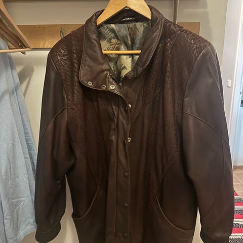 Ajatar nahkatakki kokoa 42. Vuori ja pinta ehjät, hupussa turkisreunus. Pehmeää nahkaa.
