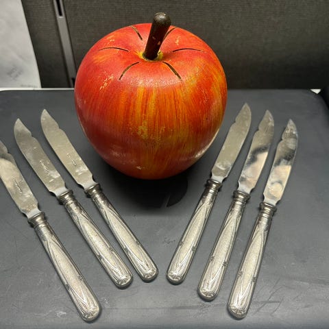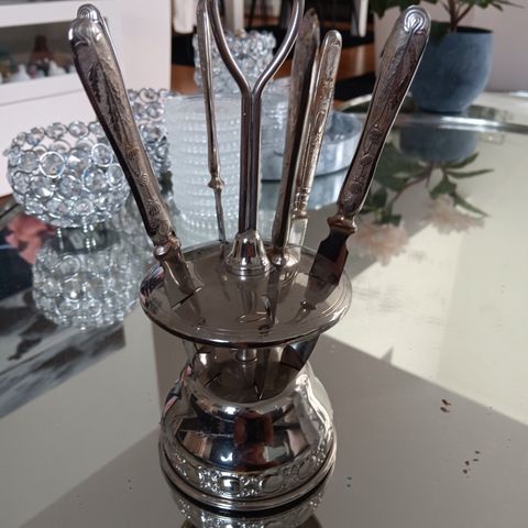 Loistokuntoinen setti vanhaa Sorsakosken tuotantoa. Hedelmäveitset omassa telineessään.