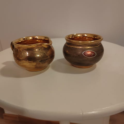 60-70 luvulta. Kynttilänjalka 150 eur, sokerikko + kermakko 40 eur. Olleet vain koristeena, ei käytön jälkiä. Tehdas sijaitsi Nurmijärvellä ja toiminnasta on historiikki. Tavarat myydään myös erikseen.