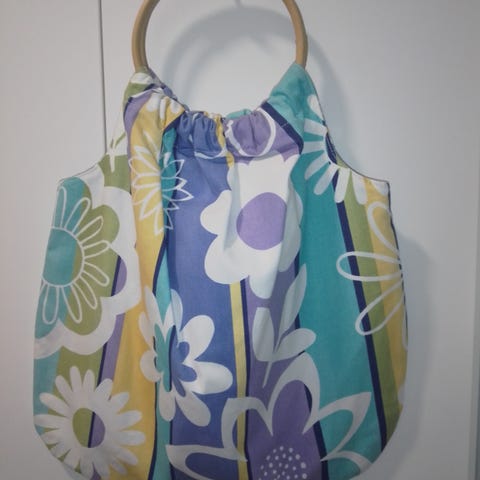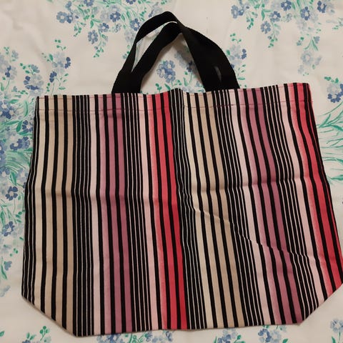 Puuvillainen raidallinen kassi. Ihan hyvä vielä. Ei ole paljon käytetty, ollut vain säilytyksessä.