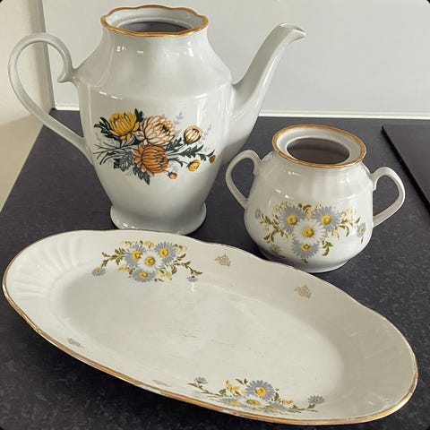 Voidaan ostaa erikseen. Sokerikko- hinta 10eur. Kahvikupit ja asetit -6eur.