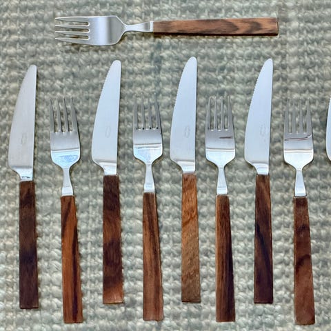 Bertel Gartenbergin suunnittelemat Triennaale haarukat 5 kpl ja veitset 4 kpl. Puuvarsi palisanteria, kaipaavat huoltoa. Haarukan pituus 18 cm, veitsi 19,5 cm.