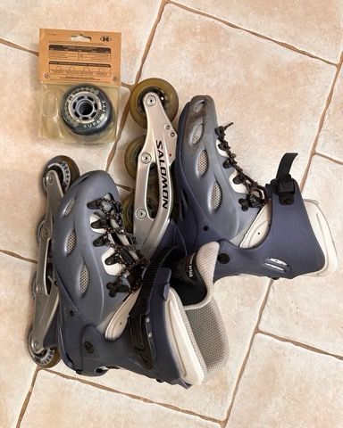 Hyväkuntoiset Salomon rullaluistimet, koko 45 2/3 (29 cm). Hinta 20 €. Postikulut 10,90 €.