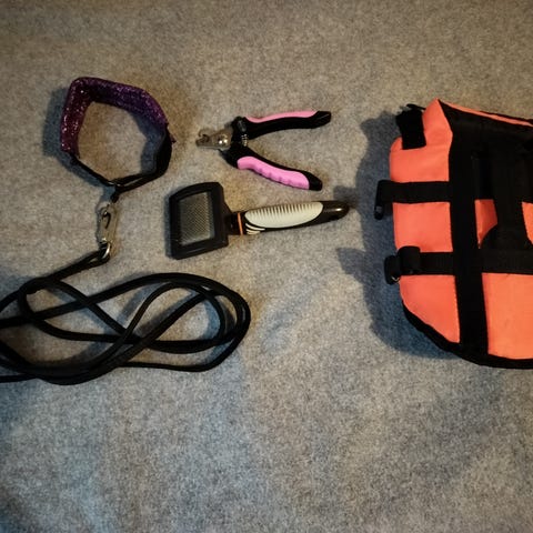 Kynsisakset, karstaharja, kampa, Raitapuku M koko, suojavaippa S koko (pestävä), muutama lelu, 2x ruoka/juomakuppi, pienen koiran kellunta liivi, 2x flexi hihna pantoineen