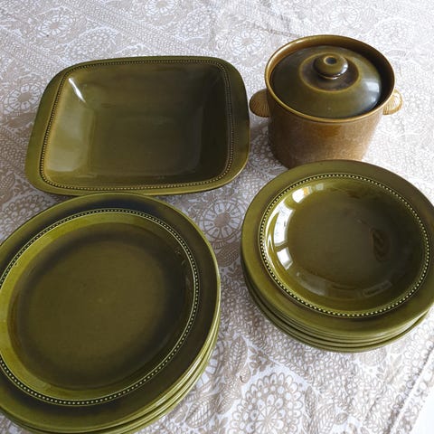 Höganäsin oliivin vihreät lautaset ja tarjoilukulho tarjoilukulo