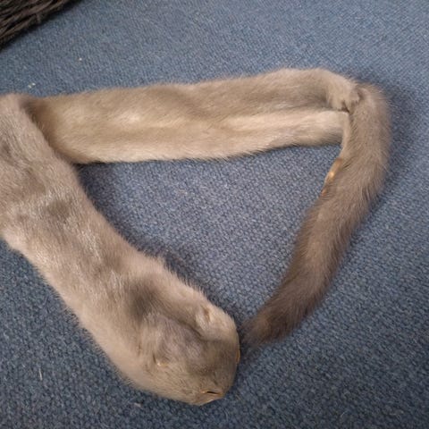 hyväkuntoinen tummanruskea minkkihuivi. Tummanruskea satiinimainen vuorikangas. Huivissa on kääntöpuolella lenkki, josta huivin päät voi pujottaa ristikkäin. Koko 110x8-12 cm.