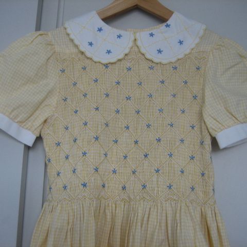 Ihana juhlamekko rypistymätöntä polysteria. Laskeutuu nätisti. Pohjaväri keltainen. Undulaatti/lehti-kuviointi. Lehdet kuvassa taittavat siniseen, mutta ovat luonnolliselta väriltään vihreät. Koko 140cm. Kuin uusi.