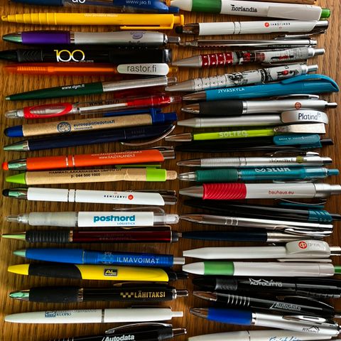 myydään mainoskyniä, n 130 kynää. Kuvassa olevien lisäksi myös muita kyniä
