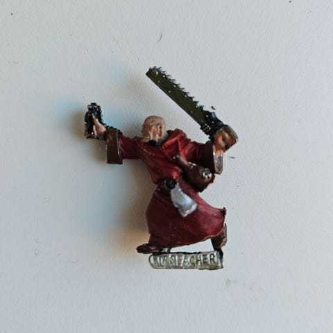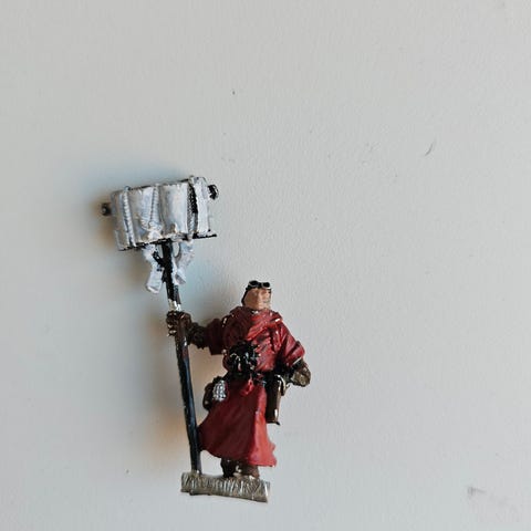 Vanhempi space marine figuuri Space Crusadesta paksulla maalikerroksella ja koristellulla pohjalla.