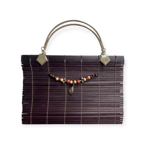 Tollanen bambu vai mikä kaisla materiaalina sekä puiset kantohihnat. Leveys n. 25.5cm ja korkeus ilman kahvoja n. 17cm.