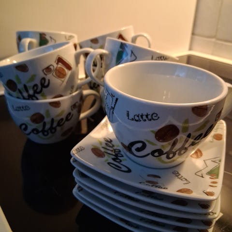 Kauniit Isot kupit ja kannellinen sokerikko . Täysin Käyttämättömät eli kunto siis aivan priimaa.