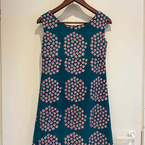 Vanha Marimekon leninki / mekko 1960- tai 1970-luvulta. Koko 38, nykykoossa ehkä 36. Mekon pituus n. 88 cm. Kainalo-kainalo-mitta 43 cm. Edessä vetoketju 42 cm. Mekkoon kuuluu myös vyö.