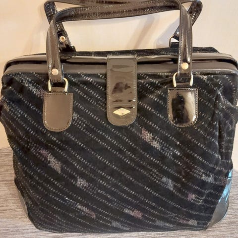 Luonnovalkoinen / vaaleanbeige kangaskassi, jonka pinnassa mustia samettisydämiä. Mitat noin 43 x 36 cm. Pohjan syvyys noin 14 cm. Kunto uutta vastaava.
